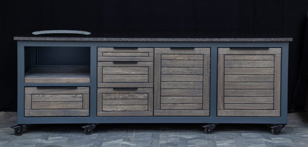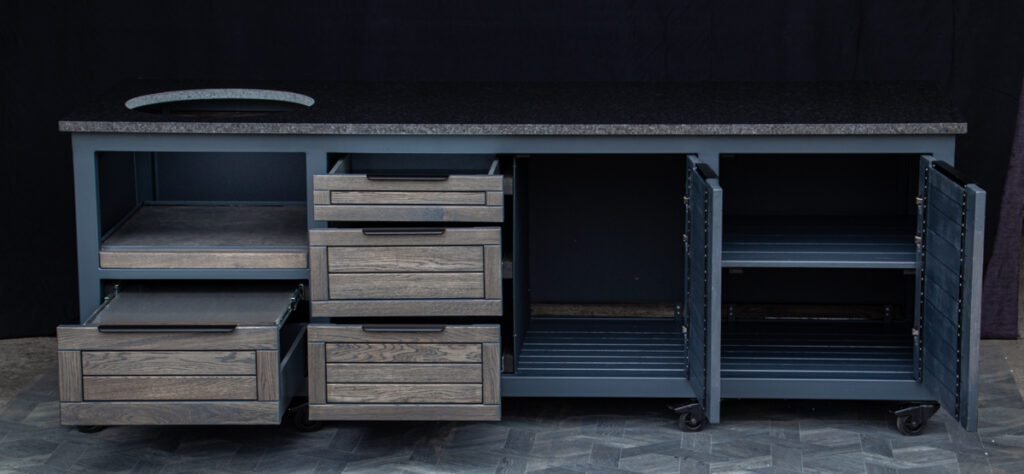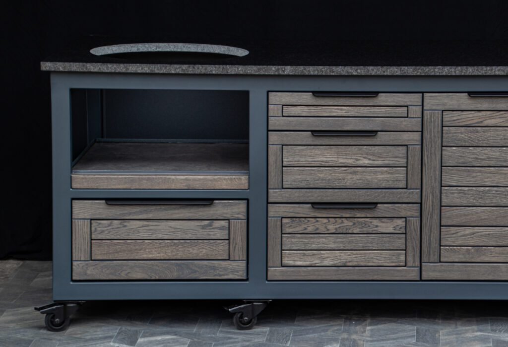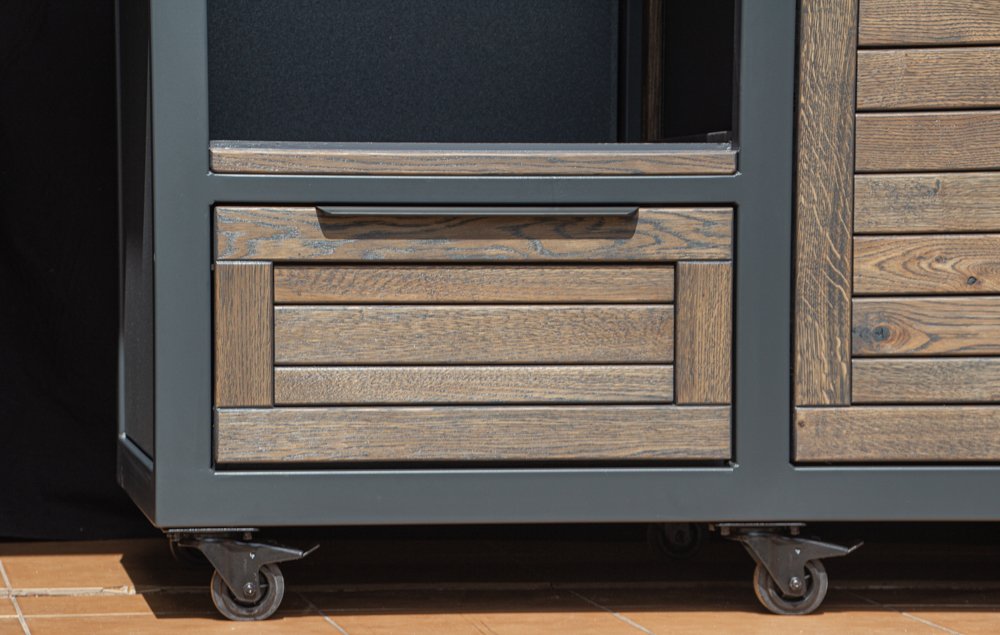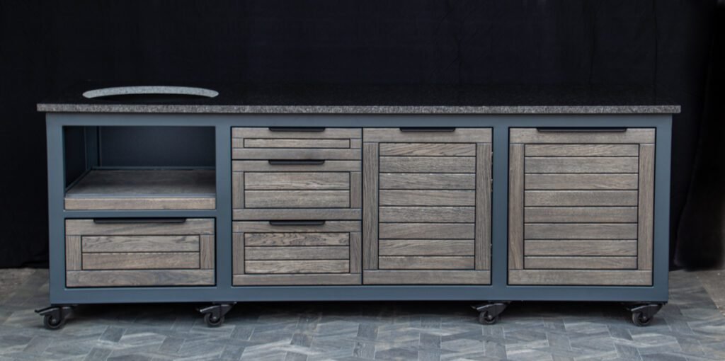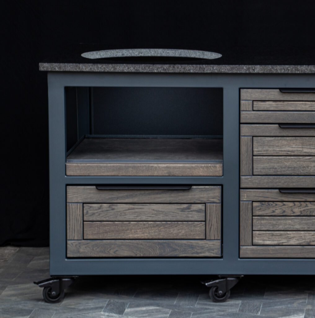 Steel frame and natural oak finish. The grill table is suitable for many BBQ grills – Green Egg, Kamado Joe, Kamado BONO, Kamado Club, Kamado Club Pro, Mustang, etc.