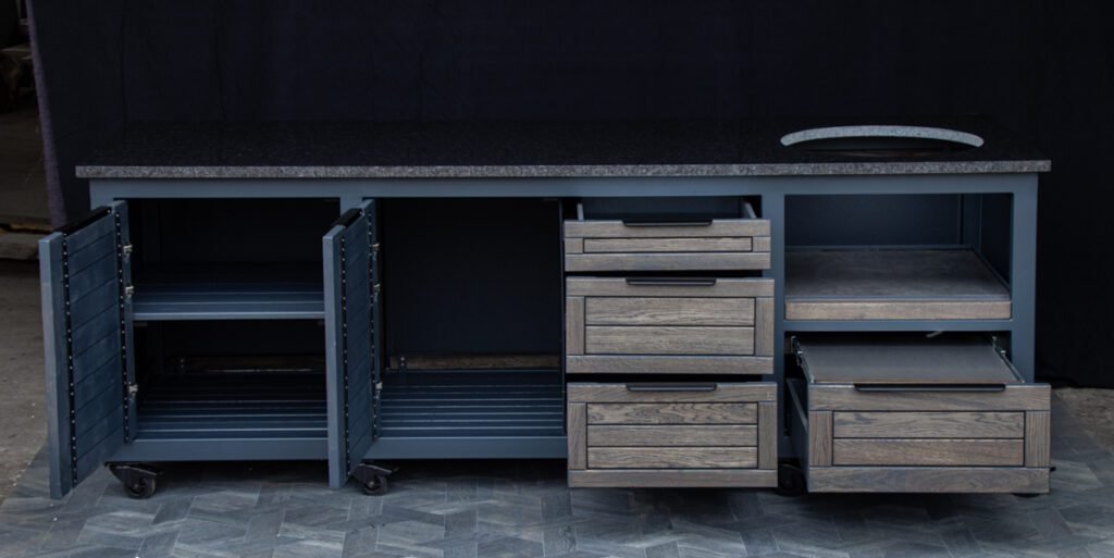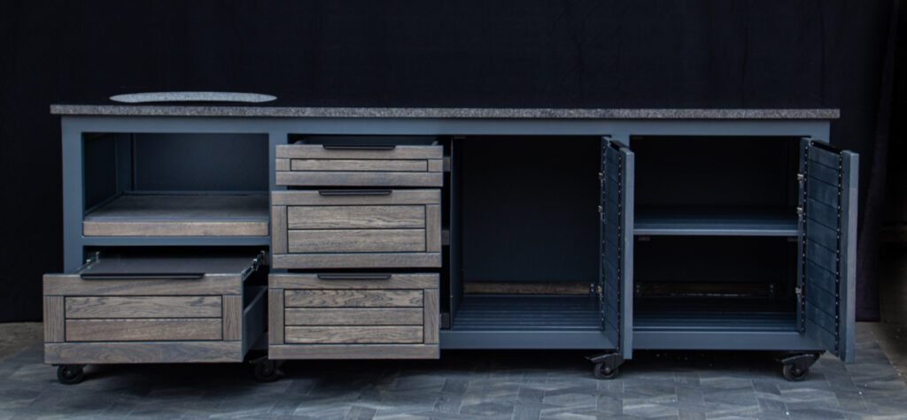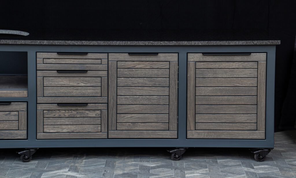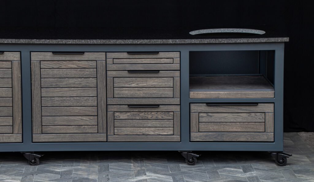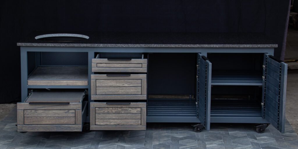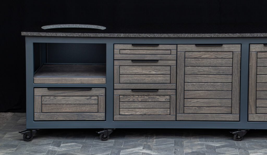 Steel frame and natural oak finish. The grill table is suitable for many BBQ grills – Green Egg, Kamado Joe, Kamado BONO, Kamado Club, Kamado Club Pro, Mustang, etc.
