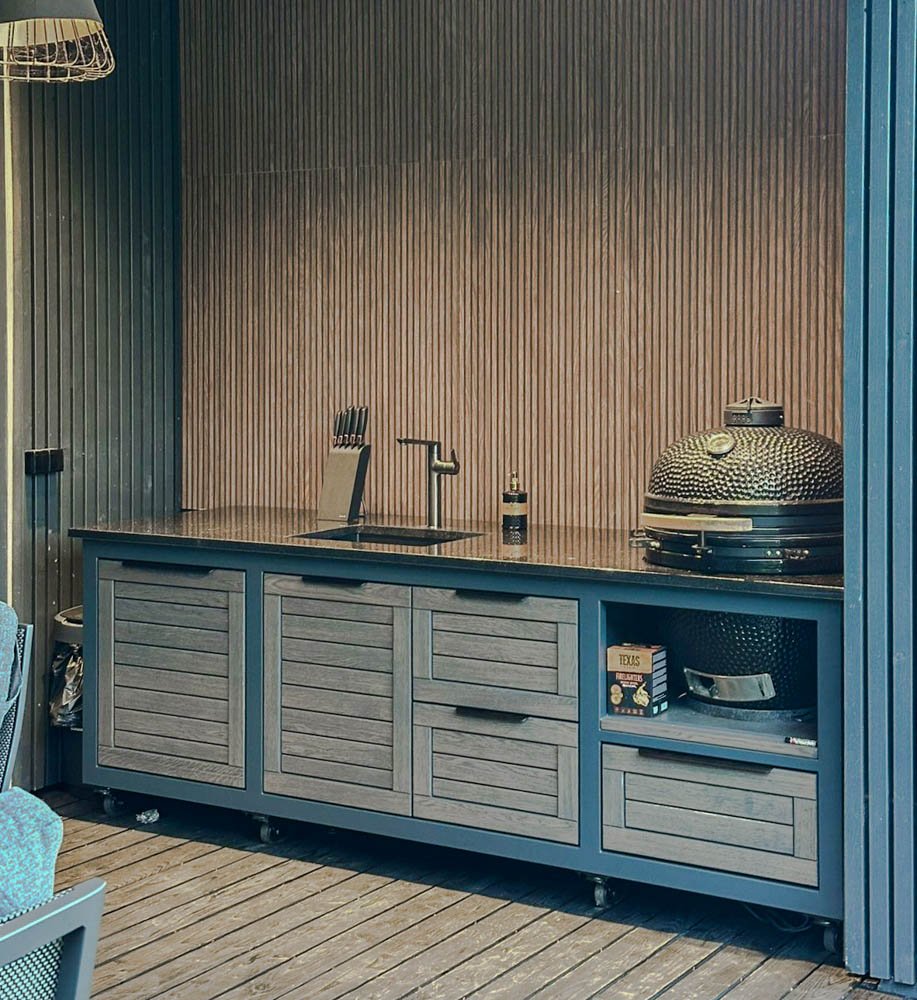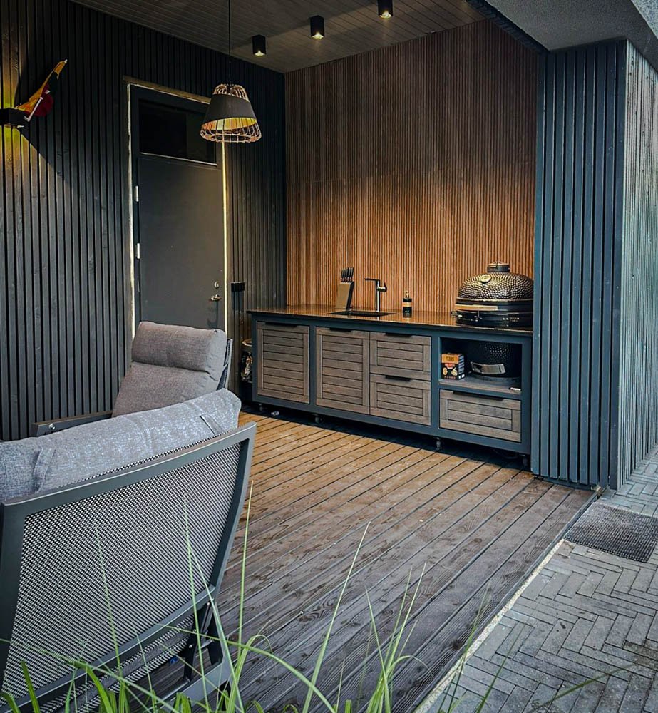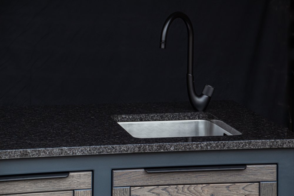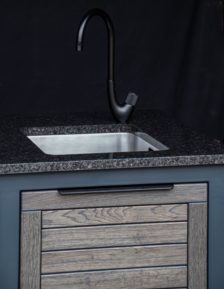 we can also offer a Franke stainless steel sink installation package, which is visually explained in one of the product photos. If you have not brought water and sewage pipes to the grilling area, you can connect the water supply from the garden hose, and for wastewater runoff, we can install a compact 20 liter wastewater collection tank under the sink, which you can remove and empty into the city sewage system.